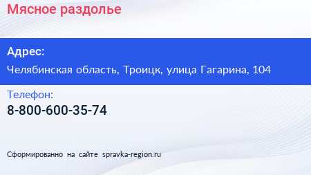 Мясное раздолье по адресу Челябинская область, Троицк, улица Гагарина, 104 в дальнейшем Организация, размещена в следующих категориях: