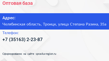 Оптовая база по адресу Челябинская область, Троицк, улица Степана Разина, 35а в дальнейшем Организация, размещена в следующих категориях:
