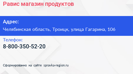 Равис, магазин продуктов по адресу Челябинская область, Троицк, улица Гагарина, 106 в дальнейшем Организация, размещена в следующих категориях: