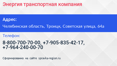 Энергия, транспортная компания по адресу Челябинская область, Троицк, Советская улица, 64а в дальнейшем Организация, размещена в следующих категориях: