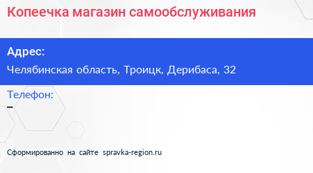 Копеечка, магазин самообслуживания по адресу Челябинская область, Троицк, Дерибаса, 32 в дальнейшем Организация, размещена в следующих категориях: