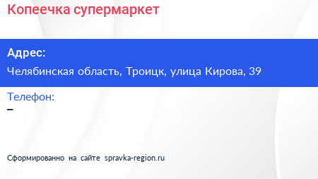 Копеечка, супермаркет по адресу Челябинская область, Троицк, улица Кирова, 39 в дальнейшем Организация, размещена в следующих категориях: