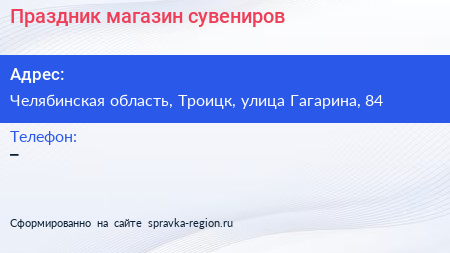 Праздник, магазин сувениров по адресу Челябинская область, Троицк, улица Гагарина, 84 в дальнейшем Организация, размещена в следующих категориях: