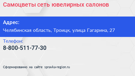 Самоцветы, сеть ювелирных салонов по адресу Челябинская область, Троицк, улица Гагарина, 27 в дальнейшем Организация, размещена в следующих категориях: