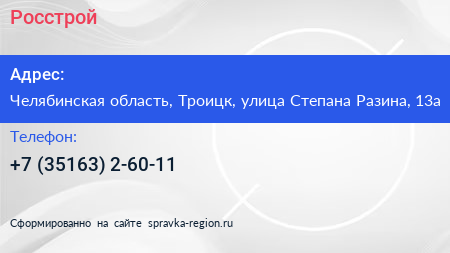 Росстрой по адресу Челябинская область, Троицк, улица Степана Разина, 13а в дальнейшем Организация, размещена в следующих категориях: