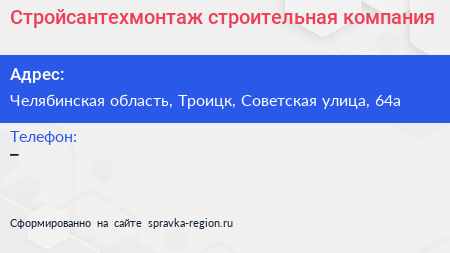 Стройсантехмонтаж, строительная компания по адресу Челябинская область, Троицк, Советская улица, 64а в дальнейшем Организация, размещена в следующих категориях: