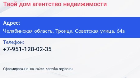 Твой дом, агентство недвижимости по адресу Челябинская область, Троицк, Советская улица, 64а в дальнейшем Организация, размещена в следующих категориях: