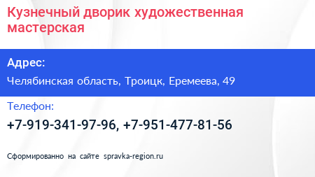Кузнечный дворик, художественная мастерская по адресу Челябинская область, Троицк, Еремеева, 49 в дальнейшем Организация, размещена в следующих категориях: