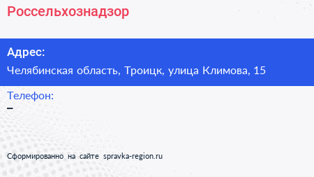 Россельхознадзор по адресу Челябинская область, Троицк, улица Климова, 15 в дальнейшем Организация, размещена в следующих категориях: