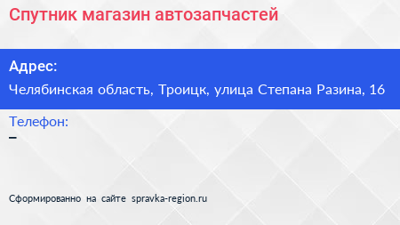 Спутник, магазин автозапчастей по адресу Челябинская область, Троицк, улица Степана Разина, 16 в дальнейшем Организация, размещена в следующих категориях: