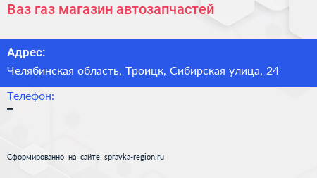 Ваз-газ, магазин автозапчастей по адресу Челябинская область, Троицк, Сибирская улица, 24 в дальнейшем Организация, размещена в следующих категориях:
