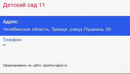 Детский сад №11 по адресу Челябинская область, Троицк, улица Пушкина, 50 в дальнейшем Организация, размещена в следующих категориях: