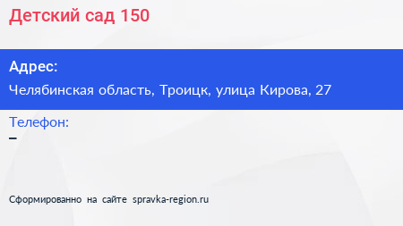 Детский сад №150 по адресу Челябинская область, Троицк, улица Кирова, 27 в дальнейшем Организация, размещена в следующих категориях: