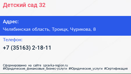 Детский сад №32 по адресу Челябинская область, Троицк, Чурикова, 8 в дальнейшем Организация, размещена в следующих категориях: