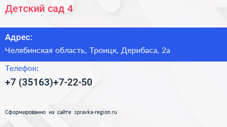Детский сад №4 по адресу Челябинская область, Троицк, Дерибаса, 2а в дальнейшем Организация, размещена в следующих категориях: