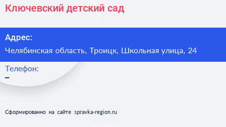 Ключевский детский сад по адресу Челябинская область, Троицк, Школьная улица, 24 в дальнейшем Организация, размещена в следующих категориях: