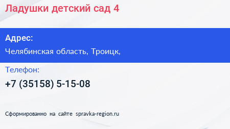 Ладушки, детский сад №4 по адресу Челябинская область, Троицк, в дальнейшем Организация, размещена в следующих категориях: