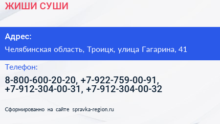 ЖИШИ СУШИ по адресу Челябинская область, Троицк, улица Гагарина, 41 в дальнейшем Организация, размещена в следующих категориях: