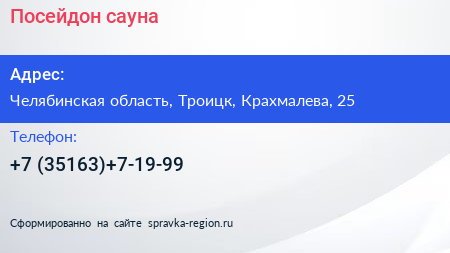 Посейдон, сауна по адресу Челябинская область, Троицк, Крахмалева, 25 в дальнейшем Организация, размещена в следующих категориях: