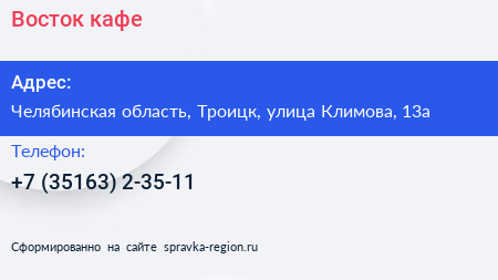 Восток, кафе по адресу Челябинская область, Троицк, улица Климова, 13а в дальнейшем Организация, размещена в следующих категориях: