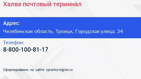 Халва, почтовый терминал по адресу Челябинская область, Троицк, Городская улица, 24 в дальнейшем Организация, размещена в следующих категориях: