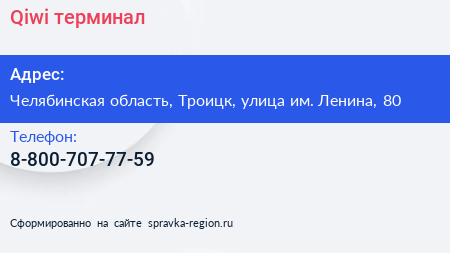 Qiwi, терминал по адресу Челябинская область, Троицк, улица им. Ленина, 80 в дальнейшем Организация, размещена в следующих категориях: