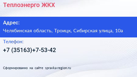 Теплоэнерго, ЖКХ по адресу Челябинская область, Троицк, Сибирская улица, 10а в дальнейшем Организация, размещена в следующих категориях: