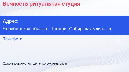 Вечность, ритуальная студия по адресу Челябинская область, Троицк, Сибирская улица, 6 в дальнейшем Организация, размещена в следующих категориях:
