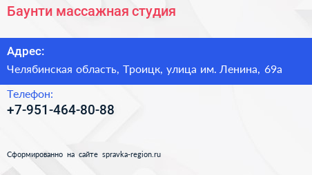 Баунти, массажная студия по адресу Челябинская область, Троицк, улица им. Ленина, 69а в дальнейшем Организация, размещена в следующих категориях: