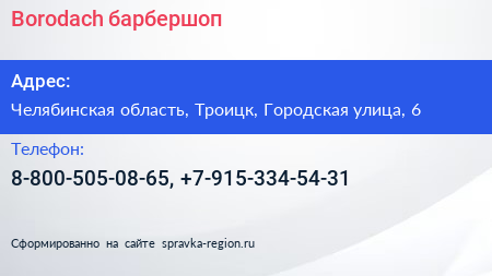Borodach, барбершоп по адресу Челябинская область, Троицк, Городская улица, 6 в дальнейшем Организация, размещена в следующих категориях: