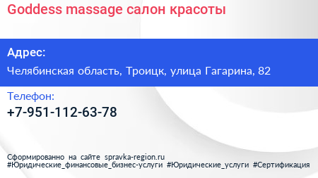 Goddess massage, салон красоты по адресу Челябинская область, Троицк, улица Гагарина, 82 в дальнейшем Организация, размещена в следующих категориях: