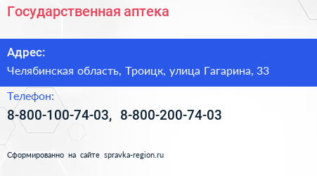 Государственная аптека по адресу Челябинская область, Троицк, улица Гагарина, 33 в дальнейшем Организация, размещена в следующих категориях: