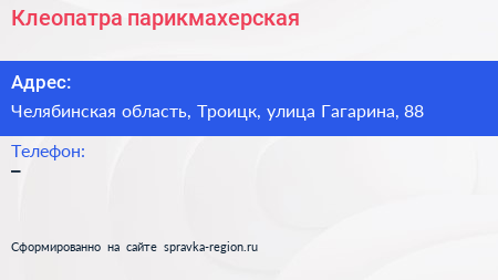 Клеопатра, парикмахерская по адресу Челябинская область, Троицк, улица Гагарина, 88 в дальнейшем Организация, размещена в следующих категориях: