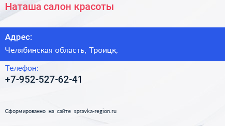Наташа, салон красоты по адресу Челябинская область, Троицк, в дальнейшем Организация, размещена в следующих категориях: