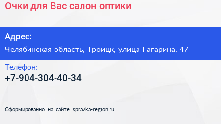Очки для Вас, салон оптики по адресу Челябинская область, Троицк, улица Гагарина, 47 в дальнейшем Организация, размещена в следующих категориях: