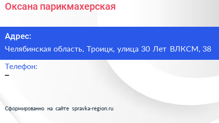 Оксана, парикмахерская по адресу Челябинская область, Троицк, улица 30 Лет ВЛКСМ, 38 в дальнейшем Организация, размещена в следующих категориях:
