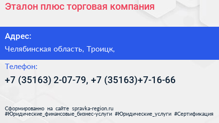 Эталон плюс, торговая компания по адресу Челябинская область, Троицк, в дальнейшем Организация, размещена в следующих категориях: