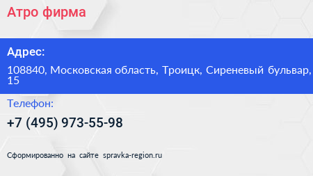 Атро, фирма по адресу 108840, Московская область, Троицк, Сиреневый бульвар, 15 в дальнейшем Организация, размещена в следующих категориях: