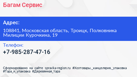 Багам Сервис по адресу 108841, Московская область, Троицк, Полковника Милиции Курочкина, 19 в дальнейшем Организация, размещена в следующих категориях: