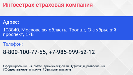 Ингосстрах, страховая компания по адресу 108840, Московская область, Троицк, Октябрьский проспект, 17Б в дальнейшем Организация, размещена в следующих категориях: