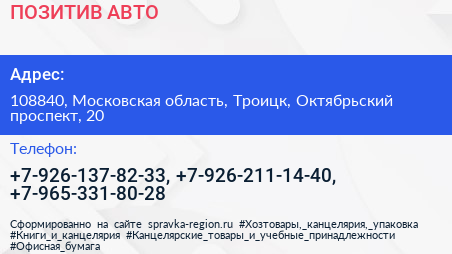ПОЗИТИВ АВТО по адресу 108840, Московская область, Троицк, Октябрьский проспект, 20 в дальнейшем Организация, размещена в следующих категориях: