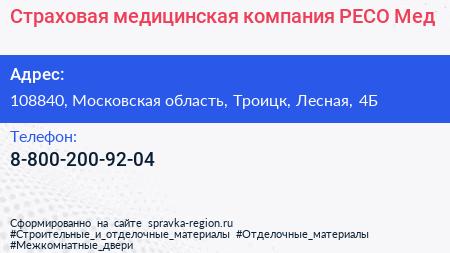 Страховая медицинская компания РЕСО-Мед по адресу 108840, Московская область, Троицк, Лесная, 4Б в дальнейшем Организация, размещена в следующих категориях: