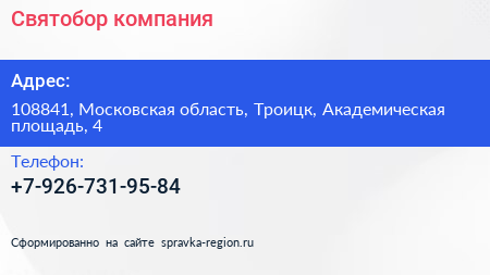 Святобор, компания по адресу 108841, Московская область, Троицк, Академическая площадь, 4 в дальнейшем Организация, размещена в следующих категориях: