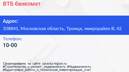 ВТБ, банкомат по адресу 108841, Московская область, Троицк, микрорайон В, 42 в дальнейшем Организация, размещена в следующих категориях: