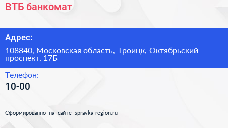 ВТБ, банкомат по адресу 108840, Московская область, Троицк, Октябрьский проспект, 17Б в дальнейшем Организация, размещена в следующих категориях: