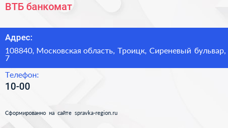ВТБ, банкомат по адресу 108840, Московская область, Троицк, Сиреневый бульвар, 7 в дальнейшем Организация, размещена в следующих категориях: