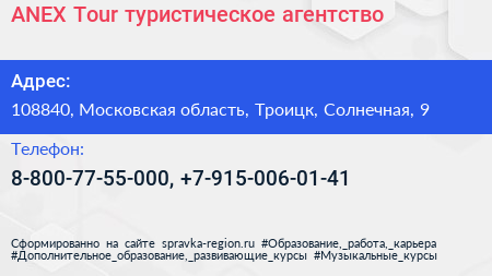 ANEX Tour, туристическое агентство по адресу 108840, Московская область, Троицк, Солнечная, 9 в дальнейшем Организация, размещена в следующих категориях:
