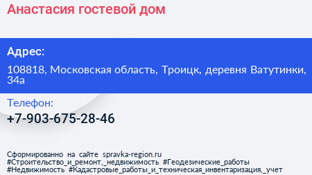 Анастасия, гостевой дом по адресу 108818, Московская область, Троицк, деревня Ватутинки, 34а в дальнейшем Организация, размещена в следующих категориях: