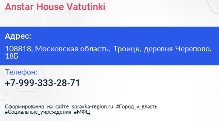 Anstar House Vatutinki по адресу 108818, Московская область, Троицк, деревня Черепово, 18Б в дальнейшем Организация, размещена в следующих категориях: