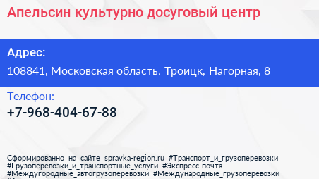 Апельсин, культурно-досуговый центр по адресу 108841, Московская область, Троицк, Нагорная, 8 в дальнейшем Организация, размещена в следующих категориях: